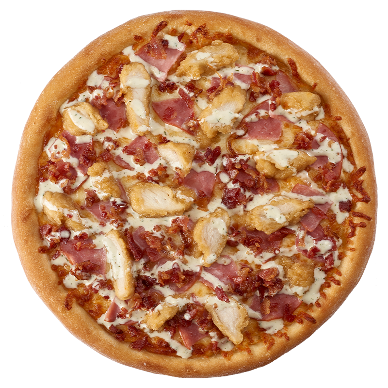 No sauce base, breaded chicken, ham, and bacon, drizzled with homemade ranch